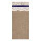 The design features a lovely rustic burlap effect background with a romantic vintage white lace effect trim finished with a stunning navy ribbon with bow.