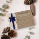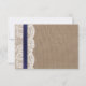 The design features a lovely rustic burlap effect background with a romantic vintage white lace effect trim finished with a stunning navy ribbon with bow.
