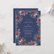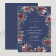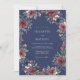 A deep navy backdrop is adorned with a rich, cascading border of deep red roses, delicate blue blossoms, and lush green foliage. This design evokes a feeling of classic romance with its elegant floral arrangement.