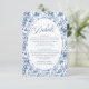 Elevate your celebration stationery with this French Toile de Jouy roses details card in elegant navy blue, royal blue, dusty blue, and deep blue tones. Featuring delicate floral artwork and refined script typography, this enclosure card or insert adds timeless charm to your suite. Perfect for sharing event information in a coordinated, sophisticated style.