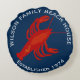 Red, white and blue, round red lobster family beach house throw pillow. Personalise with curved, printed text at top and bottom. Include the family name and year established. A big lobster silhouette in the centre.