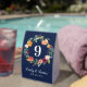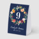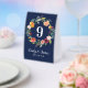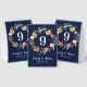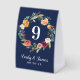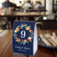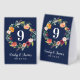 Rustic romantic style wedding table number cards feature a stylish monogram with numbers framed by a floral watercolor wreath with beautiful roses, dahlias, peony flowers, and greenery, in a gorgeous autumn palette of burgundy red, golden yellow, peach orange, blush pink, and shades of green. A rich navy blue background colour.