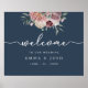 This wedding Welcome poster features painted watercolor pink flowers and greenery with elegant white fonts on a navy blue background. This poster is part of matching wedding suite that includes a wedding Invitation and many other wedding essentials.