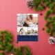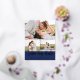 Wedding save the date postcard you can personalise with three of your own photos, two smaller and one larger. Save our date is written across the postcard in a rose gold foil script against an navy blue background. Add your names and wedding date in an elegant timeless font. Rose gold foil save the date postcard personalised with photos.