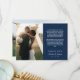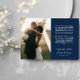 Romantic wedding thank you card printed with two of your wedding photos, a smaller one on one side and a larger on the other side. Thank you and your wedding date written in a neat white font with your names in a romantic script with a printed thank you text above on navy blue.