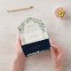 A combined wedding invitation and response card for reception only guests. Featuring hand painted snowberries and stems of eucalyptus arranged into beautiful botanical elements and frame against a dark navy outer and cream inner background. All text is fully editable, and the scattered dots on the front and back can be deleted before ordering if you would prefer. Please view this Collection in my store for versions of this product with alternative wording options, in different colours and for coordinating items.