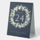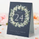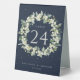 A dark navy tented sign for wedding table numbers, featuring hand painted snowberries and eucalyptus arranged into a beautiful botanical wreath. All text is fully editable. Other designs, table number products and coordinating items are available in my store.
