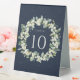 A dark navy tented sign for wedding table numbers, featuring hand painted snowberries and eucalyptus arranged into a beautiful botanical wreath. All text is fully editable. Other designs, table number products and coordinating items are available in my store.