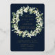 A winter wedding invitation featuring hand painted snowberries and stems of eucalyptus arranged into a beautiful botanical wreath against a dark navy background. The text and scattered dots on the front of the card are foil pressed. All text is fully editable. Please view this Collection in my store for invitations with alternative wording options, different colours and for coordinating items.