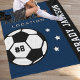 A classic soccer-themed fleece blanket featuring your custom team name, city or location, player's full name running vertically along a black side panel, jersey number on the soccer ball, and star accents. The rich navy blue and black colorway delivers a timeless, polished team look. All text and colours are fully customisable. A perfect gift for soccer players, end-of-season awards, or tournament mementos.