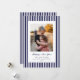 A classic flat holiday card featuring skinny navy blue and white stripes, a 'Happy New Year' message in a traditional ink pen script with fully customizable text underneath, and a photo. The backer has the same striped pattern, but it can be easily swapped out for a photo if you prefer. Available in different colors and with different holiday messages in my store.
