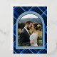 Celebrate your very first holiday season together with this elegant “Merry and Married” First Christmas Photo Card, designed with a timeless dark blue and hunter green tartan plaid pattern and luxurious gold foil lettering. This sophisticated holiday card captures the charm of classic winter style while highlighting your favourite wedding or couple photo in a beautiful arched frame.