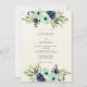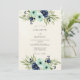 This design features a delicate arrangement of navy blue and seafoam teal anemones clustered with dark indigo berries. Lush sage green foliage and willow leaves accent the top and bottom of the cream-colored background, creating a sophisticated botanical aesthetic. The cool color palette and soft watercolor textures evoke a tranquil and airy mood perfect for a coastal or seaside event.