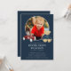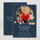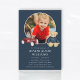 Honour the memory of a beloved child with this touching funeral announcement. This design features a cherished photograph of your little one, surrounded by sweet illustrations of a toy car and teddy bear, set against a classic navy blue background. The phrase 'In Loving Memory' elegantly precedes the name and dates, followed by the service details. This announcement serves as a gentle and loving way to share the news of a memorial service, allowing friends and family to gather and remember your precious child. The back of the card offers space for additional details like the reception venue or a personal message, ensuring all necessary information is conveyed with warmth and grace.