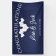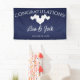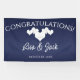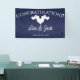 Navy Wedding Banner with Elegant White Hearts. This hanging Wedding Reception Banner is designed with soft white hearts on a navy coloured background. The text includes: Congratulations!, The Bride and Groom's First Names and Wedding Date. To personalise, simply insert your details into our easy template, replacing the sample text.
