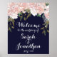 Navy wedding welcome sign pink flowers