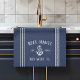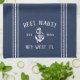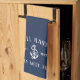 Customise your boat galley with this cute personalised kitchen towel featuring your boat name, ship's registry, and year established in white accented with an anchor illustration on a classic navy blue background.