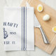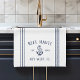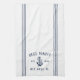 Customise your boat galley with this cute personalised kitchen towel featuring your boat name, ship's registry, and year established in navy blue lettering accented with an anchor illustration.