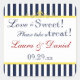 "Love is Sweet! Please take a treat!" is the text on this nautical inspired modern and affordable 1.5" square shaped navy blue and white stripes candy buffet wedding favour sticker with a yellow scroll along the top and red and navy lettering on it that matches the wedding invitation shown below. There are other shapes and sizes you can choose. ****PLEASE be careful if you do change the sticker shape, as parts of the design and/or text may get cut off as the safe boundary for text is quite large. If you change fonts, they also may extend into the safe boundary, so its best to contact me to make another shape for you. If you need assistance, email niteowlstudio@gmail.com.