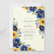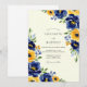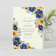 This design features a vibrant array of navy blue and golden yellow watercolor blooms. Richly pigmented peonies and delicate poppies are accented by soft sage green leaves against a warm cream background. The painterly style creates a lush botanical atmosphere suitable for an elegant seasonal event. The aesthetic is both traditional and artistically expressive.