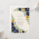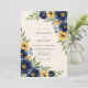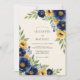This design features a sophisticated palette of deep navy blue and sunny golden yellow. Painterly watercolor anemones and lush greenery create rich floral clusters against a cream backdrop. Delicate blue berries and soft sage leaves add depth to this elegant arrangement, perfect for a refined spring or summer event.