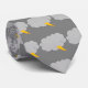 Stormy weather men's necktie has a grey background with grey puffy clouds projecting little yellow lightning bolts, perfect dress up, foul weather gear.