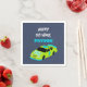 Create personalised party supplies for Need 4 Speed themed 4th birthday parties. These fun napkins feature an illustration of a stock car style race car in lime green and bright blue against a navy blue background. The napkins are ready to be personalised with your own custom greeting and name.