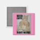 This humourous magnet features a sleepy eyed manx cat sitting upright along with the funny pun - "Need Coffee Right Meow!"