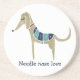 Cute cartoon hound dog in profile with long nose and eyelashes wearing a red collar and blue striped dog coat