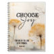 Christian inspirational quote scripture notebook, journal depicts a vintage artistic design with golden dandelion flowers on a white and grey abstract background. It features the caption, "Choose Joy" with an encouraging Bible Verse Nehemiah 8:10, "The Joy of the Lord is my strength."
