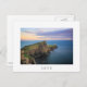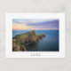Postcard of a landscape with the iconic Neist Point Lighthouse, built on the cliffs at the western coast of the island of Skye, one of the Hebrides in Scotland, at sunset with a white border and the text 'Skye'.