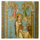 In this splendid NeoGothic Swiss devotional print, St. Cecilia of Rome (3rd century) is depicted playing an upright pipe organ. Her long auburn hair hangs loose and tumbles over her shoulders and down her back. She wears a mediaeval-style, cream-coloured gown lined in green over a dark red-orange kirtle. The gown has a square neckline and bell sleeves. + On the print’s left is a potted lily plant. In the religious language of flowers, lilies signify purity. Despite her private vow of virginity, St. Cecilia was forced into an arranged marriage with a pagan named Valerian. The marriage was never consummated. The long and the short of it is that her new husband, having seen an apparition of the angel that guarded his wife’s virtue, converted to Christianity and respected her vow. + Against the aqua background patterned with gold dots and stars, two angels hover in the space above St. Cecilia. Clad in salmon pink, one angel holds an unfurled scroll; clad in green, the other angel plays a portative or hand-held organ. It is said that on her wedding day, St. Cecilia “sang in her heart to the Lord” instead of revelling; hence, her patronage of musicians (especially organists) and singers as represented by the two angels. + The entire scene is enclosed in a NeoGothic architectural framework and a border with colourful floral bosses. + Epilog: St. Cecilia, her husband St. Valerian, and her brother-in-law St. Tiburtius were all martyred. But, that’s a story for another day! + Feast: November 22 + Image Credit (BNG 02): Antique NeoGothic image of St. Cecilia, originally published in chromolithography by Benziger & Co., Einsiedeln, Switzerland, late 19th-early 20th century, from the designer’s private collection of religious ephemera.