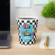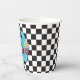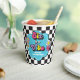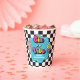 Neon 90's retro Six is a vibe 6th birthday paper cups with hearts, daisies, disco ball and chequered background.