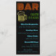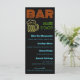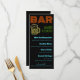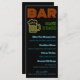 This custom event or party menu features a neon bar sign on a black background. The title "BAR" is printed across the top in a neon orange, retro style font. An image of a pint of beer is placed below, followed by a variety of sample drinks and cocktail ingredients.