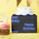 Neon blue Happy Birthday sign on dark grey brick pattern.