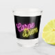 Fun and inspirational neon pink and yellow "carpe diem" word art shot glass is a reminder to "Seize the day!" Perfect for by the pool, the beach, or even at your favourite tailgate party.