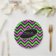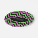 Colourful neon paper plate, with a pink, green, and black chevron zigzag pattern. Graphics of a neon green and magenta framed black oval text area, in the middle of the plate, has neon green and pink text ready to personalise for your event. Matching products are available.