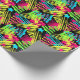 A fun Christmas wrapping paper feature bright blue, yellow, green and pink neon Christmas trees on a black background.