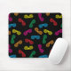 Vector illustration of multi-coloured party glasses in a repeating pattern against a black background.