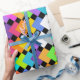 This wrapping paper has a geometric design of neon diamonds overlapping each other on a field of black.