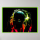 neon dj girl graphics poster. In bright neon green border against a black silhouette background this colourful drawing of a female dj is an exciting image for your bedroom walls . In bright shades of yellow blues reds and oranges this poster has a funky yet retro feel.