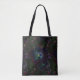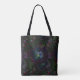 This tote bag presents a dramatic abstract pattern! A neon electric rose is outlined in deep, rich colours of red, blue, magenta, yellow, green and purple. The black background adds to the magical, mysterious feeling.