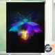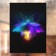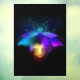 Antique, mechanical firefly with light bulb and thin wings glows orange, purple, turquoise on black background. Steampunk style.