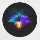 Antique, mechanical firefly with light bulb and thin wings glows orange, purple, turquoise on black background. Steampunk style.