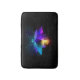 Antique, mechanical firefly with light bulb and thin wings glows orange, purple, turquoise on black background. Steampunk style.