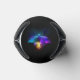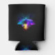 Antique, mechanical firefly with light bulb and thin wings glows orange, purple, turquoise on black background. Steampunk style.