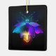 Antique, mechanical firefly with light bulb and thin wings glows orange, purple, turquoise on black background. Steampunk style.