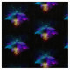 Antique, mechanical firefly with light bulb and thin wings glows orange, purple, turquoise on black background. Steampunk style.