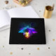 Antique, mechanical firefly with light bulb and thin wings glows orange, purple, turquoise on black background. Steampunk style.