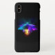 Antique, mechanical firefly with light bulb and thin wings glows orange, purple, turquoise on black background. Steampunk style.